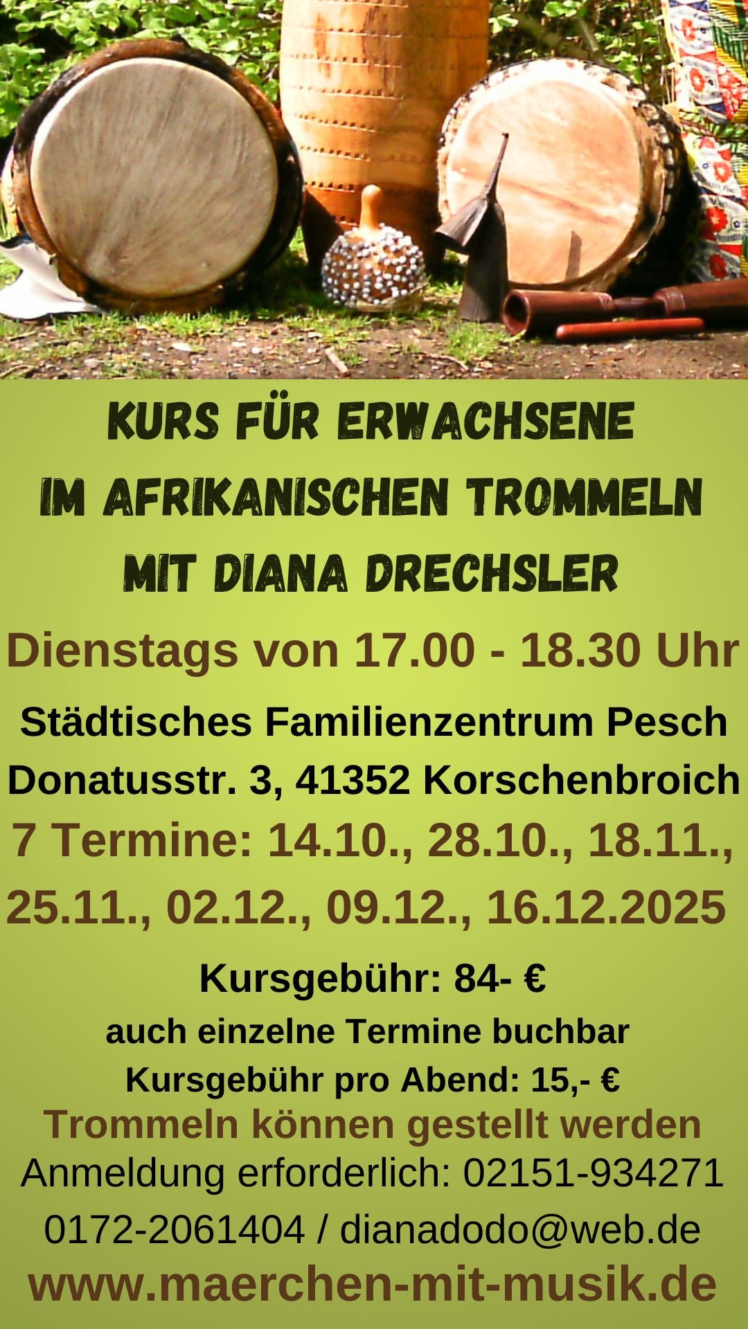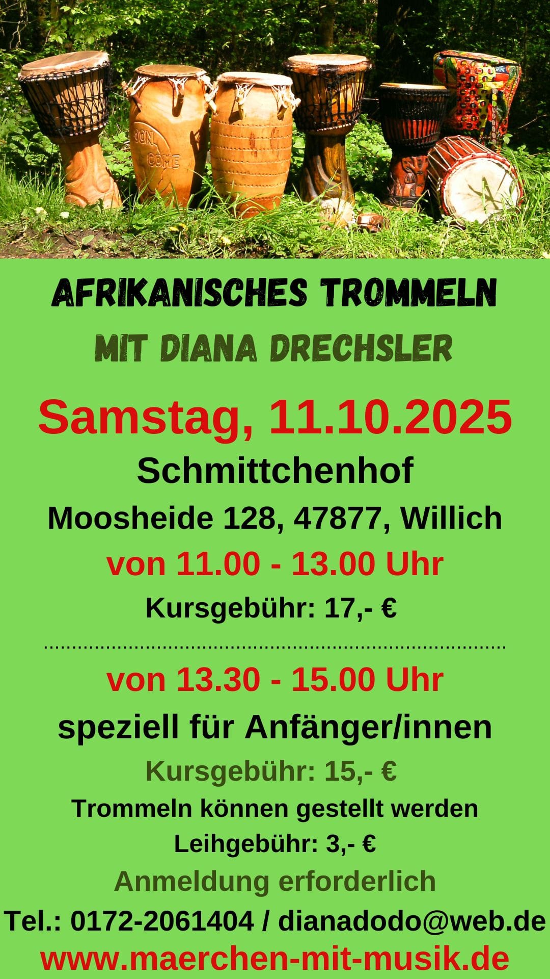 Außerdem ist Diana Drechsler als Dozentin für "Afrikanisches Trommeln" tätig und leitet Kurse, Workshops und Projekte für Kinder, Jugendliche und Erwachsene. Gerne kommt Sie auch für Ferienangebote in die Einrichtungen.