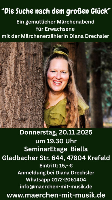 Die Märchenerzählerin und Musikerin Diana Drechsler aus Krefeld möchte ihr Publikum zu einer Reise in die wunderbare und zauberhafte Welt der Märchen mit Musik einladen, eine Welt voller Träume, Wünsche, Sehnsüchte und Hoffnung, aber auch voller Ängste, Hindernisse und Verwandlung. Sonderbare Dinge passieren, die den Menschen auf der Suche nach dem großen Glück begegnen.
